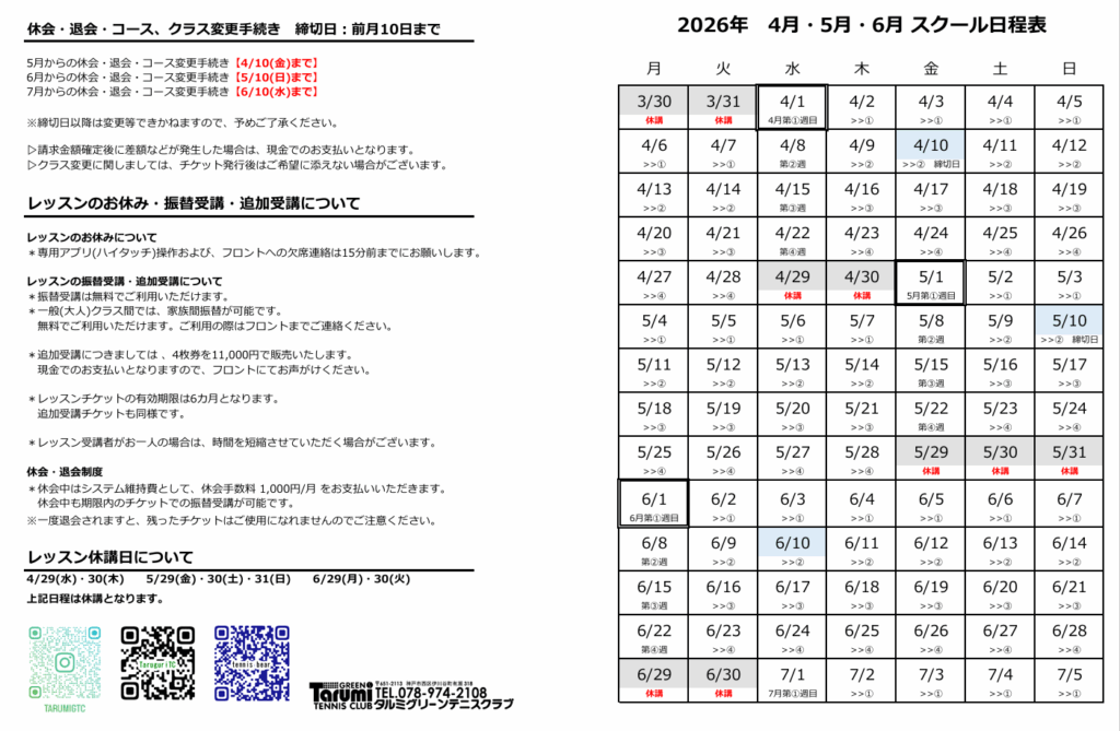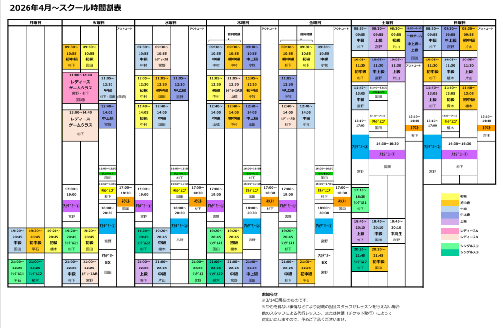 【スクール日程表・時間割表】2026年4月~