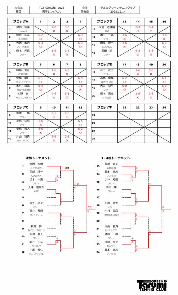 2025.12.14(日)【オープン男子シングルス】 イベント 2025.12.18 優勝:大西 宏治(ノアTA垂水)準優勝:堀井 拓斗(長田高校)コンソレ優勝:濱田 煉(フリー) おめでとうございます🎊✨ 今年最後のオープン男子シングルスご参加いただき、ありがとうございました! 次回の開催日は 1月11日(日) です!2026年もどうぞよろしくお願いいたします🎾 テニスベアより、エントリーの受付も開始しております🙆たくさんのご参加をお待ちしております!✊🏻🔥
